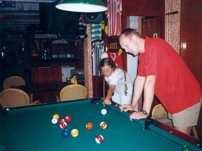 "Pass auf, Reinhild, das ist ganz einfach: Ein Rückläufer, der ohne Effet gespielt eine Bande anläuft, verlässt diese im gleichen Winkel, unter dem er aufgetroffen ist. Wird er jedoch mit Effet gespielt, so wirkt dieses Effet unter Berücksichtigung der geringfügigen Richtungsänderung beim Auftreffen auf die Bande wie beim direkt mit Effet auf die Bande gespielten weißen Ball. So, jetzt probier mal..." |